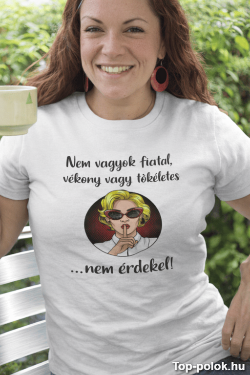 Ez a vicces póló nem érdekel hangulatot kiabálja világgá: „Nem vagyok fiatal, vékony vagy tökéletes… nem érdekel!” 😄 Pont azoknak szól, akik nem kérnek a megfelelési kényszerből, és inkább nevetnek egy jót az egészen.