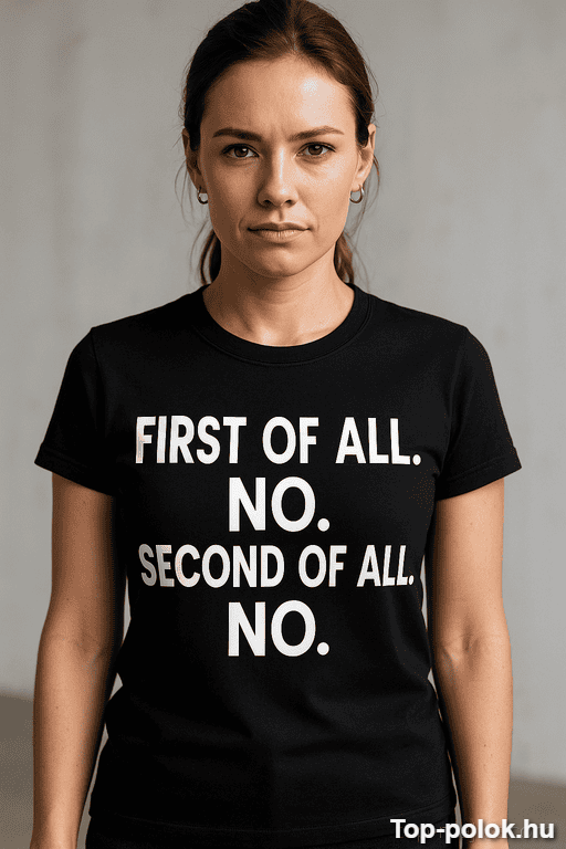 Ez a vicces póló ajándék azoknak szól, akiknek a „nem” teljes mondat. A felirat: „First of all. No. Second of all. No.” – és ezzel mindent elintéz. 😄