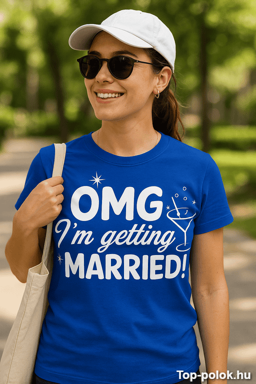 Ez a vicces póló lánybúcsú ajándék pont azt a pillanatot kapja el, amikor a menyasszony rájön: „Úristen, tényleg férjhez megyek!” – és ettől egyszerre nevet és izgul. A „OMG I’m getting married!” felirat azonnal beszél helyette, így mindenki tudja, ki a főszereplő a buliban. 😄