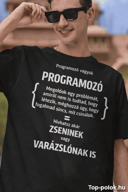 Ez a vicces póló programozó ajándék azoknak készült, akik egyetlen poénnal el tudják magyarázni a szakmájuk lényegét: „Megoldok egy problémát, amiről nem is tudtad, hogy létezik… úgy, hogy fogalmad sincs, mit csinálok.” És a végén jön a csattanó: hívhatsz zseninek vagy varázslónak is. 🧙♂️