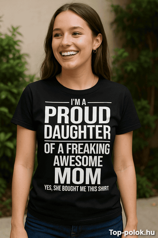 Ha olyan vicces póló ajándék kell, ami nem finomkodik, ez telitalálat. A felirat poénosan üzeni: „büszke lánya vagyok egy elképesztően menő anyának… igen, ő vette ezt a pólót.” 😄