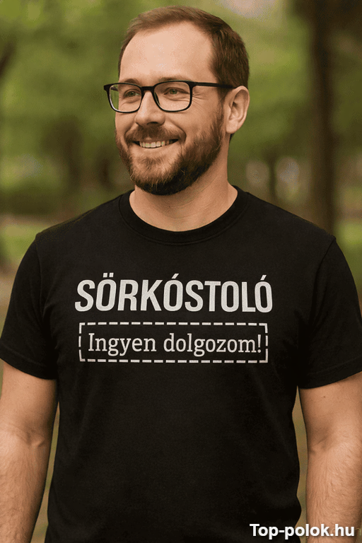Ez a vicces póló sörkóstoló hangulatra készült: a „Sörkóstoló [Ingyen dolgozom]” felirat pont annyira pimasz, amennyire egy jó esti sörözés megkívánja. Egy pillantás, és már indul is a nevetés — meg a következő kör. 😄