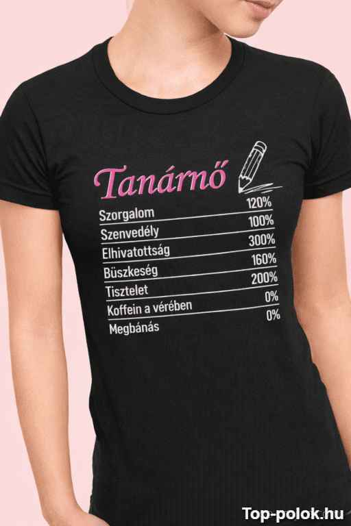 Ez a vicces póló tanárnő ajándék azoknak szól, akiknek a napja táblánál kezdődik, és a „Tanárnő” felirat mögött valójában egy emberfeletti teljesítmény dolgozik. A százalékok mindent elárulnak: szorgalom, szenvedély, elhivatottság… és igen, a megbánás stabilan 0%. 😄