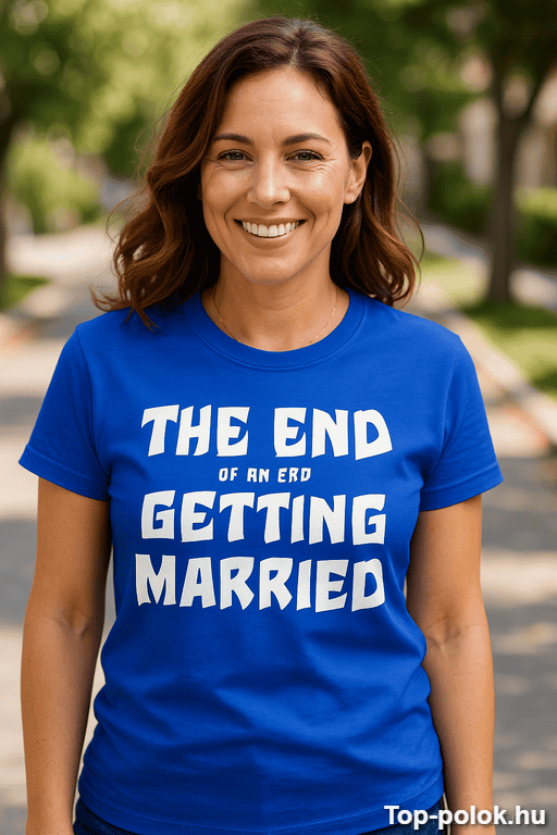 Ez a vicces esküvői póló kimondja azt, amit a baráti társaság csak suttogva mer: „The end of an era / Getting married”. Finoman csípős, mégis szerethető poén — pont attól működik, hogy egyszerre ünneplős és kicsit kárörvendő. 😅