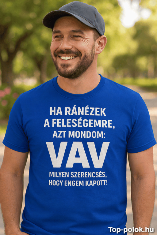 Ha a párod imádja a csipkelődő humort, ez a póló telitalálat. A felirat egyetlen pillantással elintézi: „VAV milyen szerencsés, hogy engem kapott!” 😄