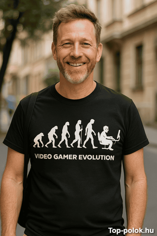 A vicces póló gamer ajándék kategória új kedvence: VIDEO GAMER EVOLUTION felirattal, ami egy pillanat alatt lebuktatja a „csak még egy meccs” életérzést. Tökéletes, ha finoman csipkelődnél, de közben elismernéd a gamer fejlődést. 😄🎮