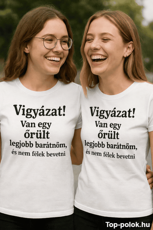 Ha olyan vicces póló barátnő ajándék kell, ami egy mondatban elintézi a határokat, meg is van: „Vigyázat! Van egy őrült legjobb barátnőm, és nem félek bevetni.” Ez az a poén, amin mindenki nevet… kicsit idegesen is. 😈