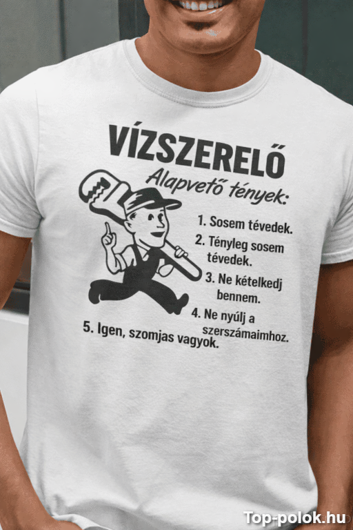 Ha kell egy vicces póló vízszerelő ajándék, ami azonnal nevetést hoz, megvan. A „Vízszerelő alapvető tények” szöveg finoman pimasz, és pontosan olyan, mint akinek szánod. 😄