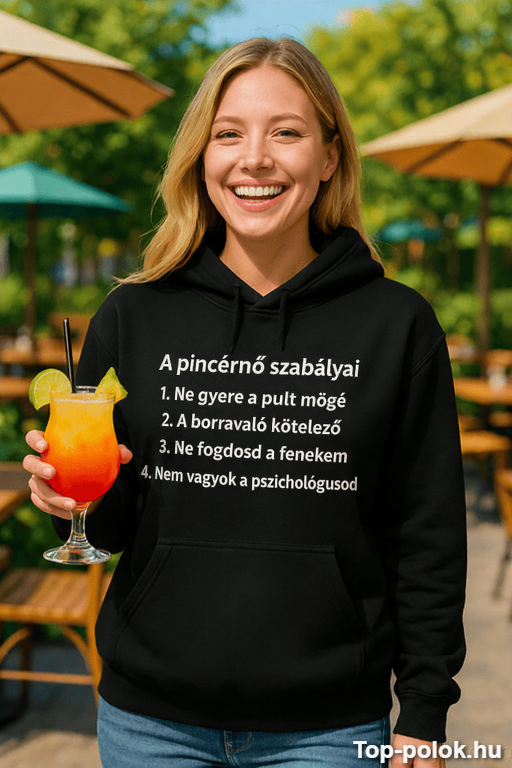 Ha olyan humoros pincérnős pulóvert keresel, ami egyértelműen üzeni: itt vannak szabályok, és azokat illik tiszteletben tartani, akkor ez az. A vicces pulóver pincérnőknek nemcsak nevetést hoz, hanem önbizalmat is ad — és a vendégek már messziről tudni fogják, mire számítsanak 😏